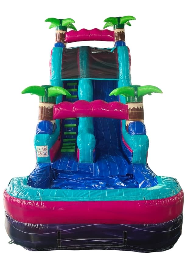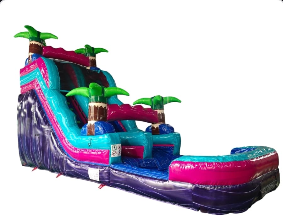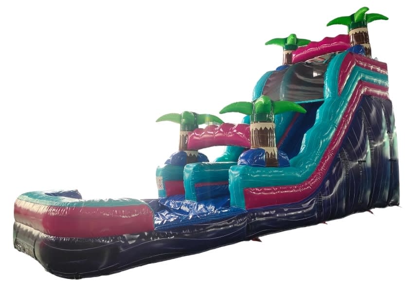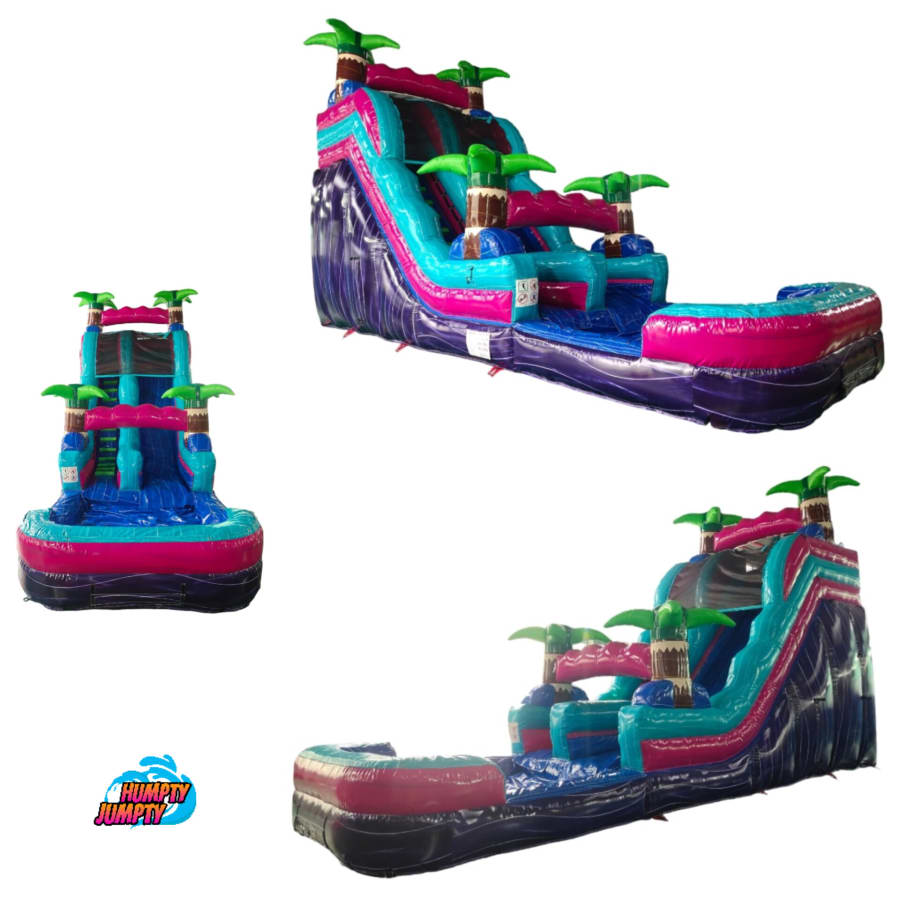 Miami Vice 18 ft Waterslide turns any ordinary party into a tropical splash zone. Bright pinks, turquoise, purple, and lime green palm trees create a high-impact visual. This 18-foot waterslide delivers big thrills, fast slides, and picture-perfect moments for kids and adults alike. 🌊