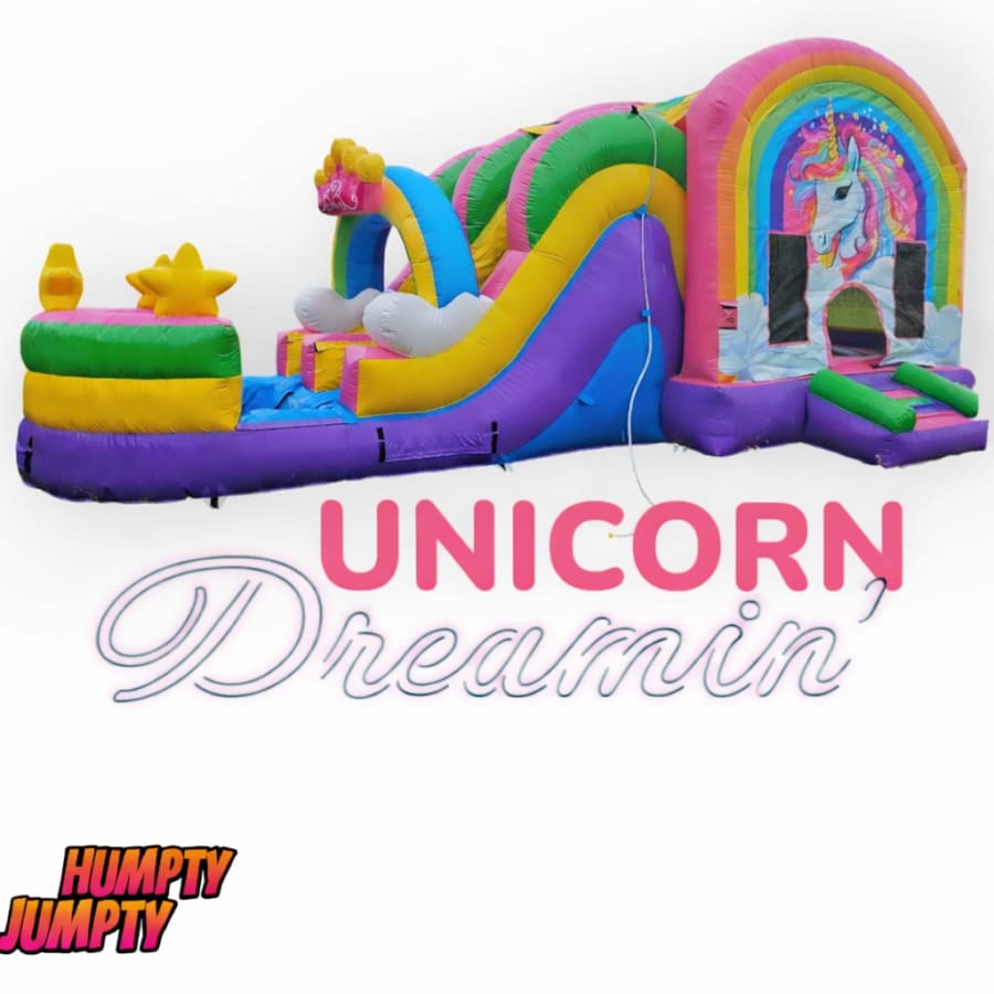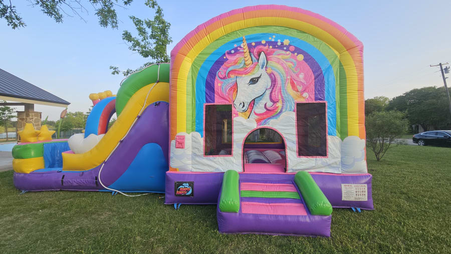 The Unicorn Dreamin' Combo is a huge bounce house with a dual lane slide. This combo is every little girls dream. The rainbows, the clouds and the Unicorn will blow you kids mind. This unit can be used wet and dry.
