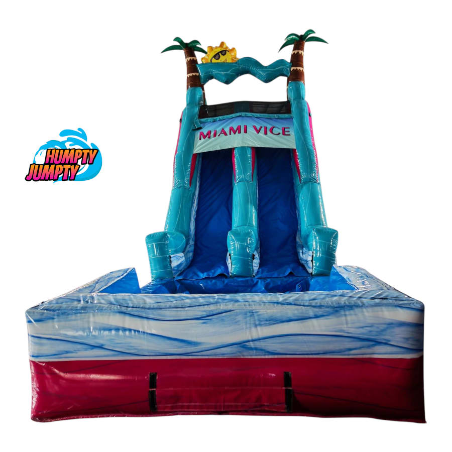 Miami Vice Dual lane 18 ft Slide is an eye-catching, adrenaline-packed water attraction. It stands 18 ft tall and boasts a 35 ft long slide run. Perfect for backyard parties, school events, and summer gatherings. Quick thrills. Safe design. Big impact. 🌴💦